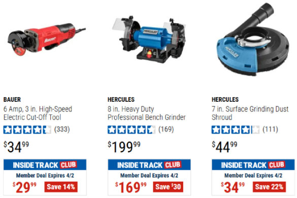 Now, let’s say you aren’t a current ITC member and you walk into your local Harbor Freight store looking for a bench grinder. If you end up buying the Hercules 8 inch grinder shown above you could essentially join the Inside Track Club on the spot for free since the $30 you’d save on the grinder would fully cover the cost of the membership.